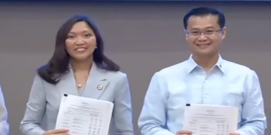 Senate Finance Chair Sherwin Gatchalian and House Appropriations Chair Mikaela Suansing showed copies of the signed bicameral conference report.