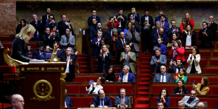 Member of parliament Mathilde Panot, President of La France Insoumise and the alliance of left-wing parties the “Nouveau Front Populaire” (New Popular Front) LFI-NFP parliamentary group, and members of parliament of left-wing parties applaud as Yael Braun-Pivet, President of the National Assembly, delivers the result of the vote on the first motion of no-confidence against the French government, tabled by the alliance of left-wing parties the “Nouveau Front Populaire” (New Popular Front – NFP), after the use by French government of the article 49.3, a special clause in the French Constitution, to push the budget bill through the National Assembly without a vote by lawmakers, at the National Assembly in Paris, France, December 4, 2024. REUTERS/Sarah Meyssonnier